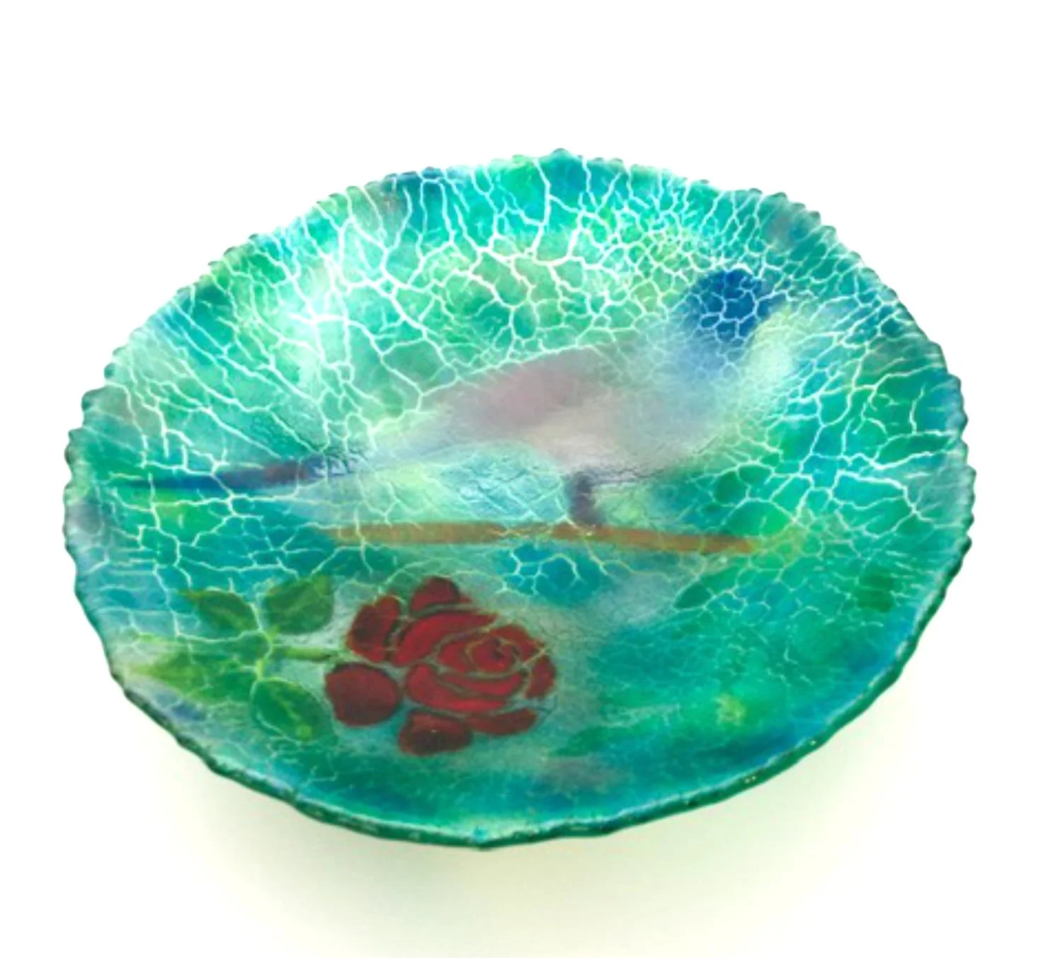 Bird In Garden: This bowl is speaks of the wonderful flowers and creature I find in my garden. It is made with the crackle technique using glass powder which creates natural, fluid and unpredictable textures.